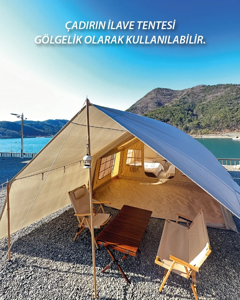 ÇADIRIN İLAVE TENTESİ ÖNDE GÖLGELİK OLARAK KULLANILABİLİR.