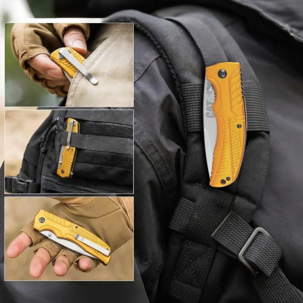 • CAT DA980006 Kemer Askı Kancalı Katlanabilir 20CM Paslanmaz Çelik Sarı Kamp Çakısı