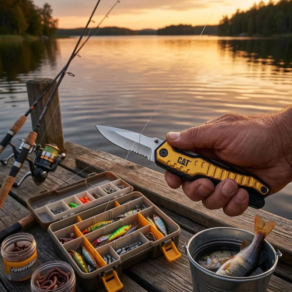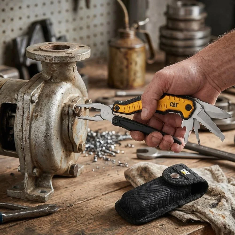 • CAT DA980045 9 IN 1 Çok Fonksiyonlu Katlanabilir 27CM Paslanmaz Çelik Sarı Kamp Çakısı Bıçağı + Taşıma Kılıfı