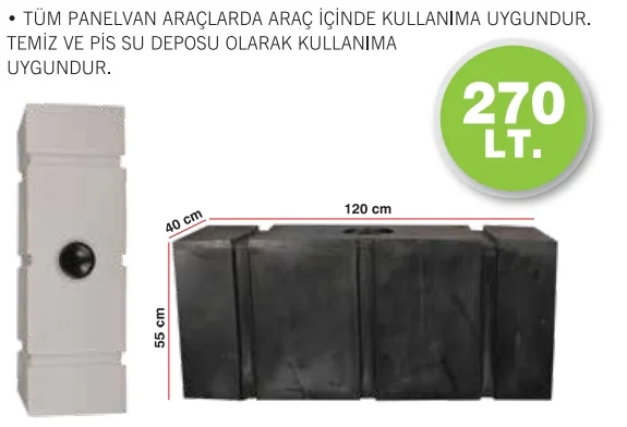 Özellikler; - Boyutlar: U. 120 cm x G. 40 cm x Y. 55 cm - Kapasite: 270 Litre - Hammadde: Polietilen - Kalınlık: 5mm - Kesilerek kapak veya giriş/çıkış eklemek mümkün - Çekme Karavan, Motokaravan için uygundur