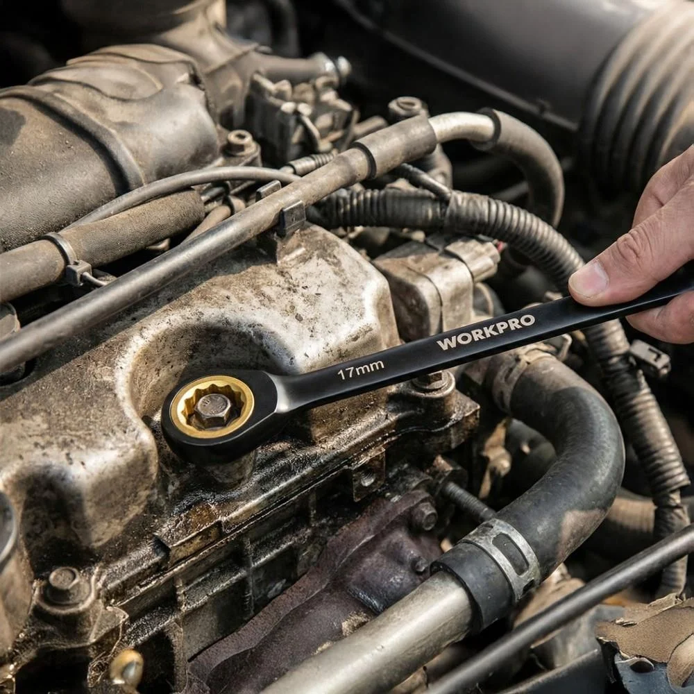 • WORKPRO WP202602 8-19mm 9 Parça CR-V Profesyonel Cırcır Kombine Anahtar Takımı + Bez Taşıma Kılıfı